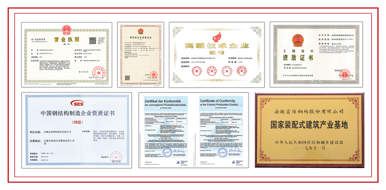 公司擁有完善的資質體系和強大的技術支撐。現有建筑工程施工總承包特級、建筑行業(yè)甲級設計資質、輕型鋼結構工程設計專項甲級、鋼結構工程專業(yè)承包一級、建筑幕墻工程專業(yè)承包一級等資質。公司現擁有企業(yè)技術中心,為安徽省創(chuàng)新型企業(yè),通過自主研發(fā)和創(chuàng)新,先后取得了二百多項專利和幾十項創(chuàng)新型技術成果,并與同濟大學、西安建筑科技大學、合肥工業(yè)大學等知名院校建立了長期、密切的"產學研"合作關系,成立了“同濟富煌多高層建筑鋼結構技術研究中心”等校企合作科研機構。2017年,富煌鋼構被國家住建部認定為首批“裝配式建筑產業(yè)基地”;2020年9月,富煌工業(yè)園成功入選全國第二批裝配式建筑產業(yè)基地(園區(qū)類產業(yè)基地)。