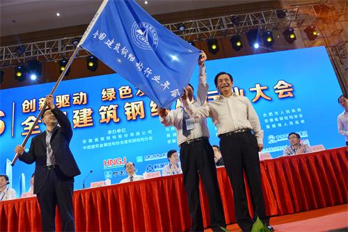 最后,楊俊斌將象征著年會(huì)承辦權(quán)的會(huì)旗交到2017年的承辦單位沈陽三新實(shí)業(yè)有限公司總經(jīng)理洪長禧手中,大家相約2017年全國建筑鋼結(jié)構(gòu)行業(yè)大會(huì)齊聚沈陽!