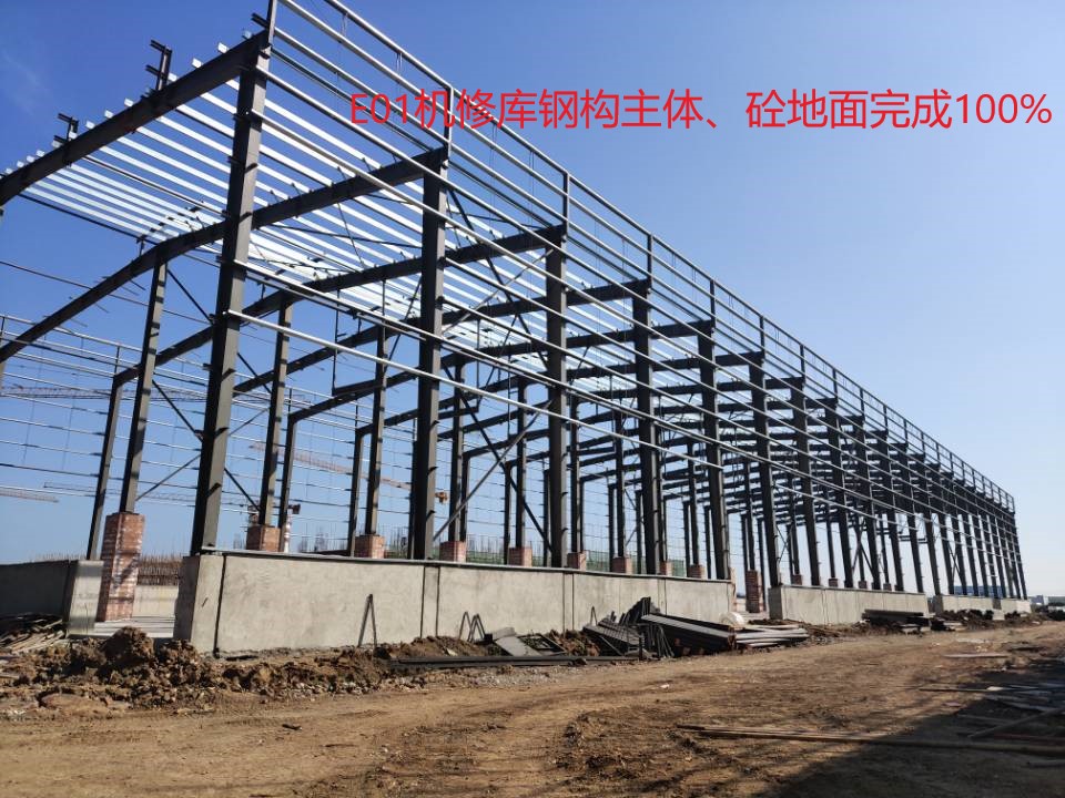 E01維修機備品備件庫鋼構(gòu)主體完成、地面砼完成100%;