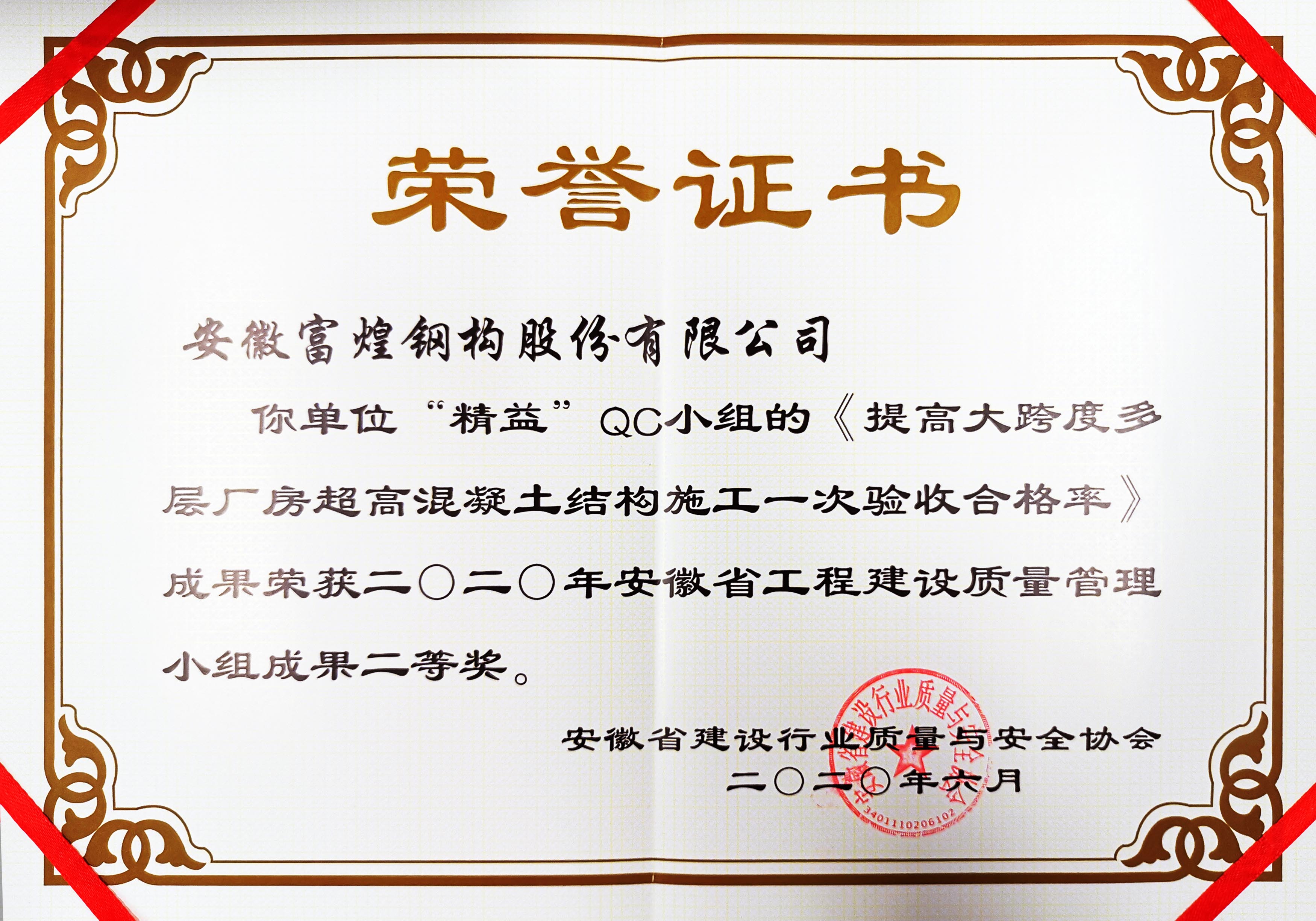 近日,安徽省建設(shè)行業(yè)質(zhì)量與安全協(xié)會(huì)公布了安徽省2020年QC成果獲獎(jiǎng)名單,由安徽富煌鋼構(gòu)股份有限公司開展并選送的兩項(xiàng)質(zhì)量管理活動(dòng):紫云廣場項(xiàng)目——《提高高層裝配式鋼框架結(jié)構(gòu)現(xiàn)澆混凝土樓板一次驗(yàn)收合格率》及合肥空港集成電路配套廠房項(xiàng)目——《提高大跨度多層廠房超高混凝土結(jié)構(gòu)施工一次驗(yàn)收合格率》兩項(xiàng)質(zhì)量管理活動(dòng)均獲得省級(jí)QC成果二等獎(jiǎng)。