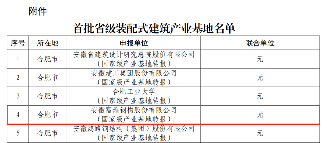 富煌鋼構(gòu)入選“安徽省首批省級(jí)裝配式建筑產(chǎn)業(yè)基地”