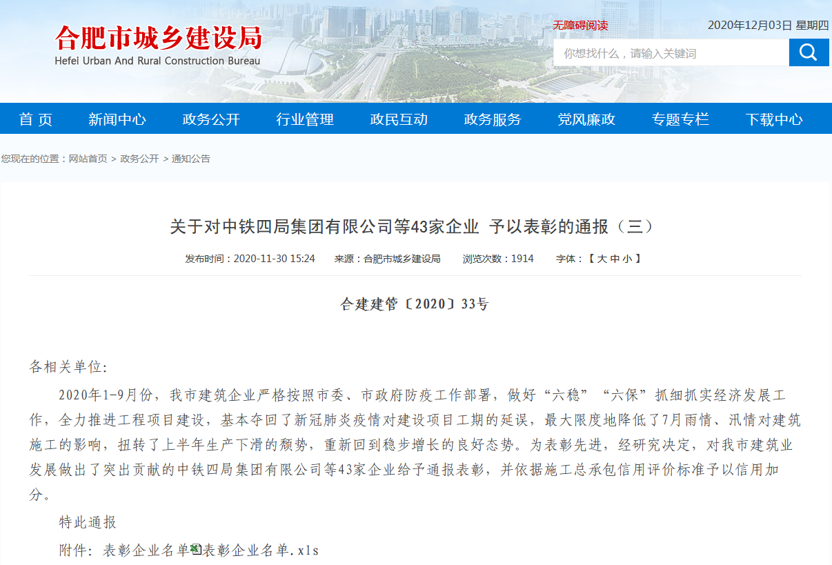 為表彰先進(jìn),經(jīng)研究決定,合肥市城鄉(xiāng)建設(shè)局對(duì)我市建筑業(yè)發(fā)展做出突出貢獻(xiàn)的43家企業(yè)給予通報(bào)表彰,并依據(jù)施工總承包信用評(píng)價(jià)標(biāo)準(zhǔn)予以信用加分。