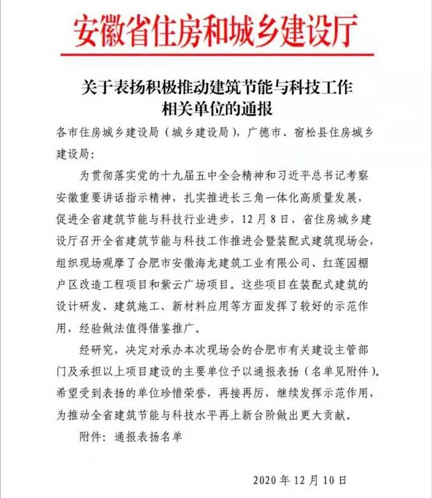 為總結經(jīng)驗,表彰先進,進一步推動安徽省建筑節(jié)能與科技工作持續(xù)健康發(fā)展,經(jīng)安徽省住房和城鄉(xiāng)建設廳研究決定對承建安徽省首個裝配式鋼結構公共建筑項目——合肥紫云廣場項目的安徽富煌鋼構股份有限公司予以通報表揚。