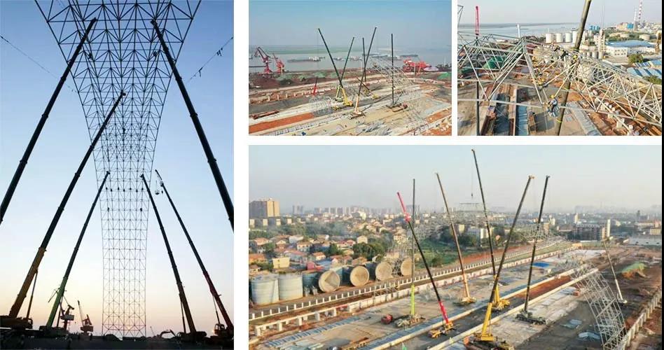 本工程為條形封閉貨場(chǎng),中間段采用三心圓柱面網(wǎng)架拱、兩側(cè)為半球形網(wǎng)架結(jié)構(gòu)。網(wǎng)架結(jié)構(gòu)長(zhǎng)度470m,跨度110m,最高高度46m,總展開面積約71889㎡。結(jié)構(gòu)跨度大,構(gòu)件多,其中桿件33456支、螺栓球8490個(gè)、焊接球38個(gè)。為保證項(xiàng)目的順利進(jìn)行,現(xiàn)場(chǎng)配備了50噸汽車吊2臺(tái)、200噸吊車4臺(tái)、300噸吊車1臺(tái),25噸吊車2臺(tái)等網(wǎng)架拼裝機(jī)械。