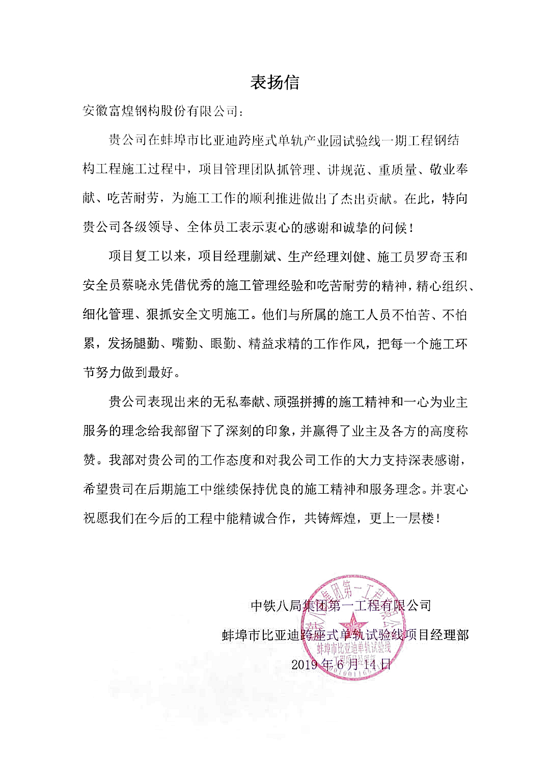 日前,安徽富煌鋼構股份有限公司收到了一封來自中鐵八局集團第一工程有限公司的表揚信。信中,中鐵八局第一工程公司高度贊揚了富煌鋼構駐蚌埠市比亞迪跨坐式單軌試驗線項目團隊兢兢業(yè)業(yè)、敬業(yè)奉獻的精神品質,對富煌鋼構項目部抓管理、講規(guī)范、重質量,推動項目順利實施的行為給予了充分肯定,并對富煌鋼構長期以來對項目的關心和貢獻表示衷心感謝!